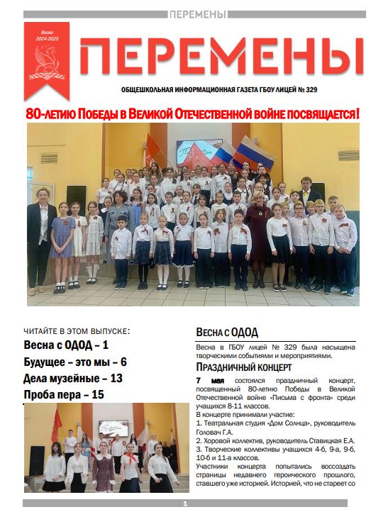 Если вы хотите стать одним из авторов нашей газеты — обращайтесь к редактору, заместителю директора по воспитательной работе, или присылайте материалы на адрес kalendar329@yandex.ru с пометкой «Перемены».