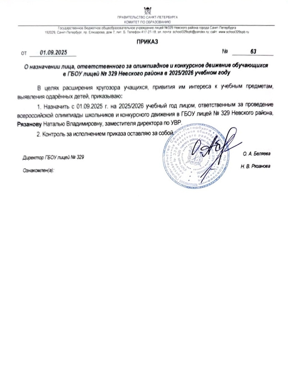 - Приказ директора лицея от 01.09.2025 №63 «О назначении лица, ответственного за олимпиадное и конкурсное движение обучающихся в ГБОУ лицее №329 в 2025/2026 учебном году»